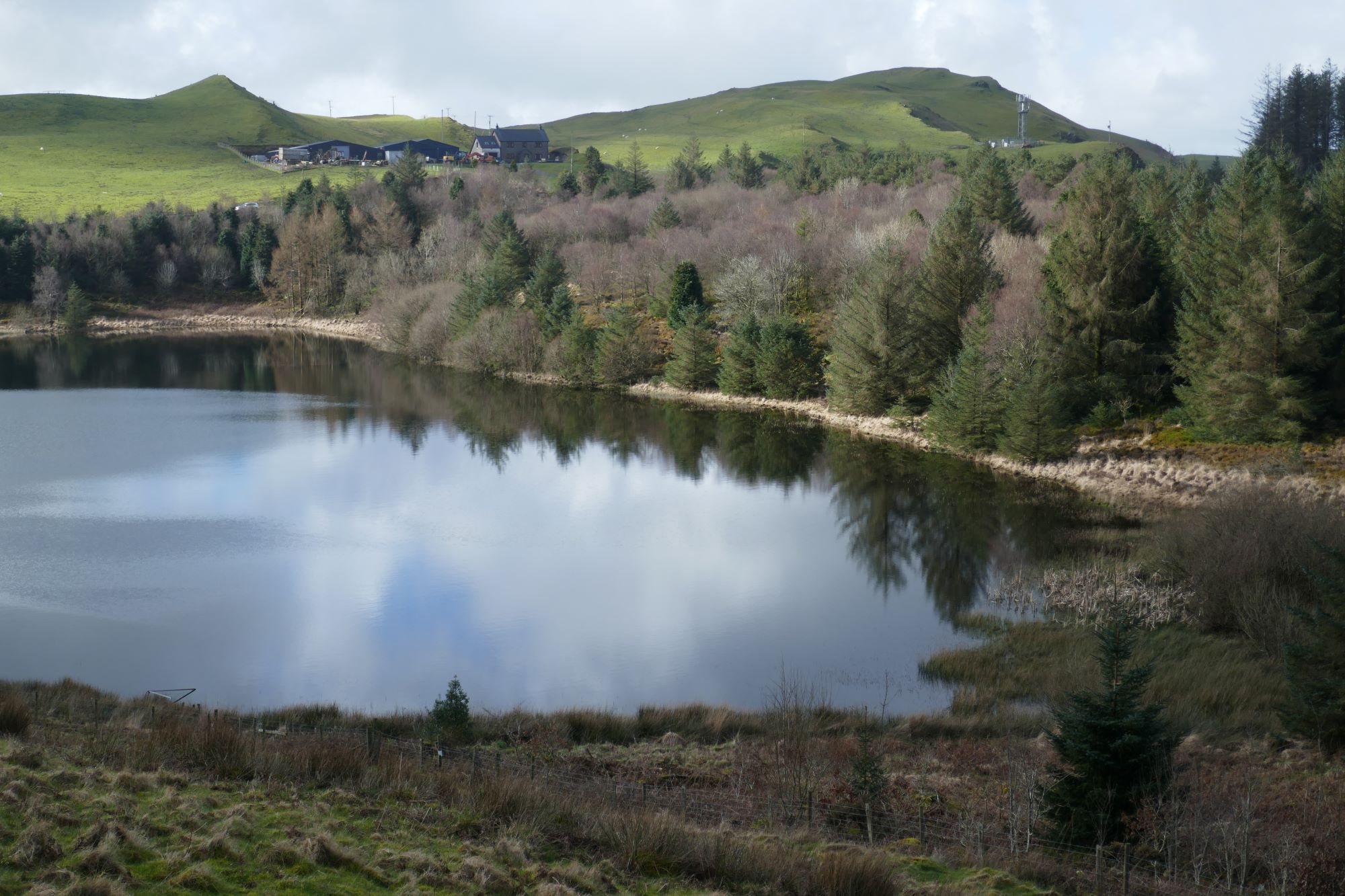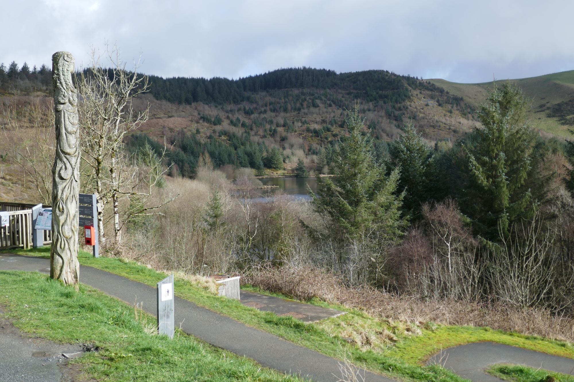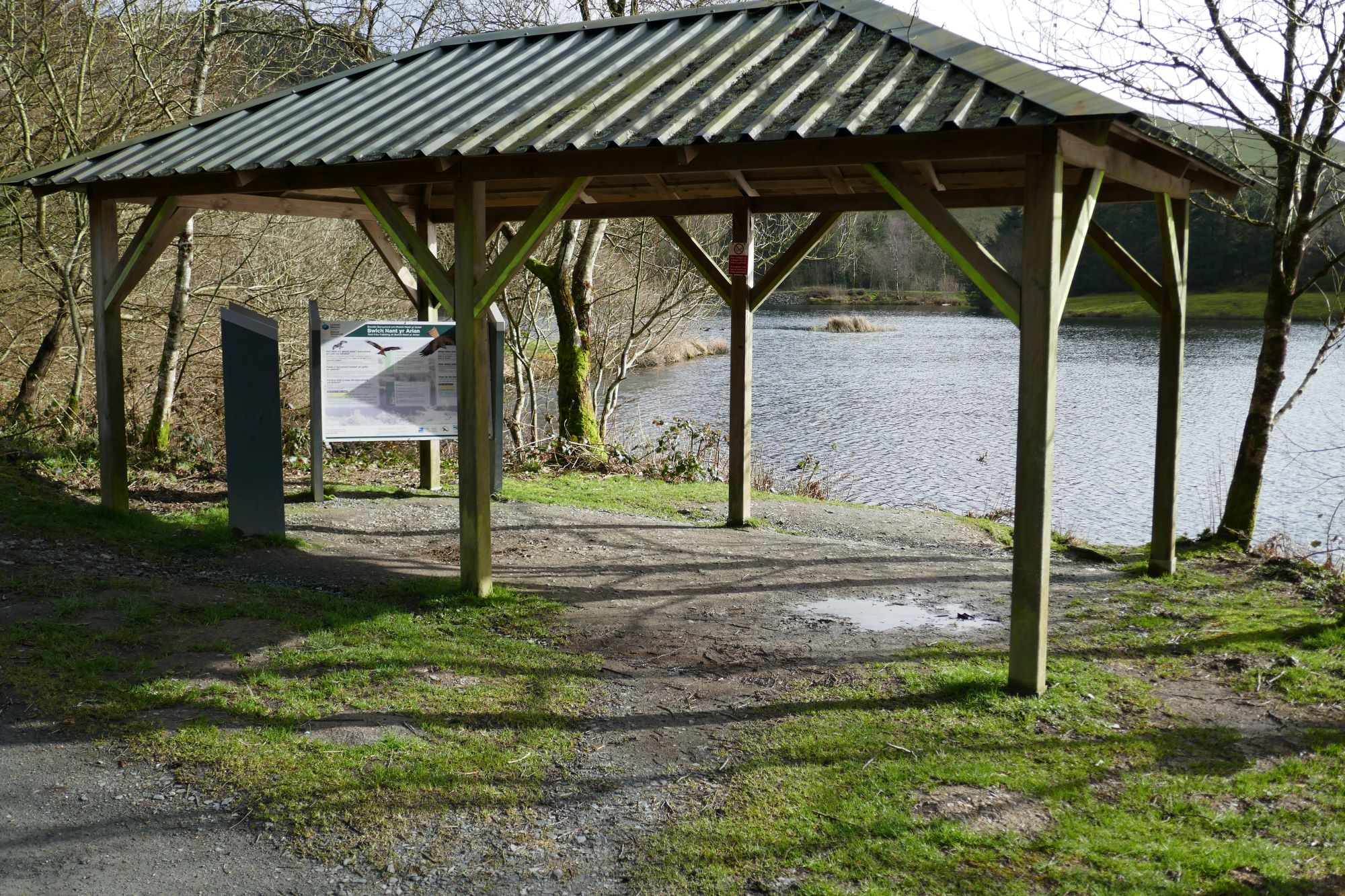From the Visitor Centre, follow the winding path down to the side of the lake, a place famous for the rescue and continuing preservation of the red kite, and a popular tourist attraction at red kite feeding times. Follow the lakeside path.