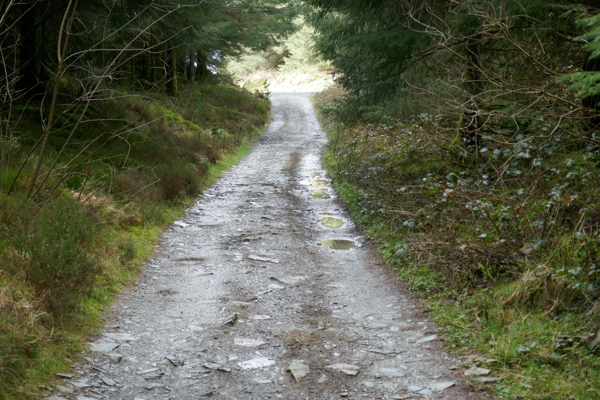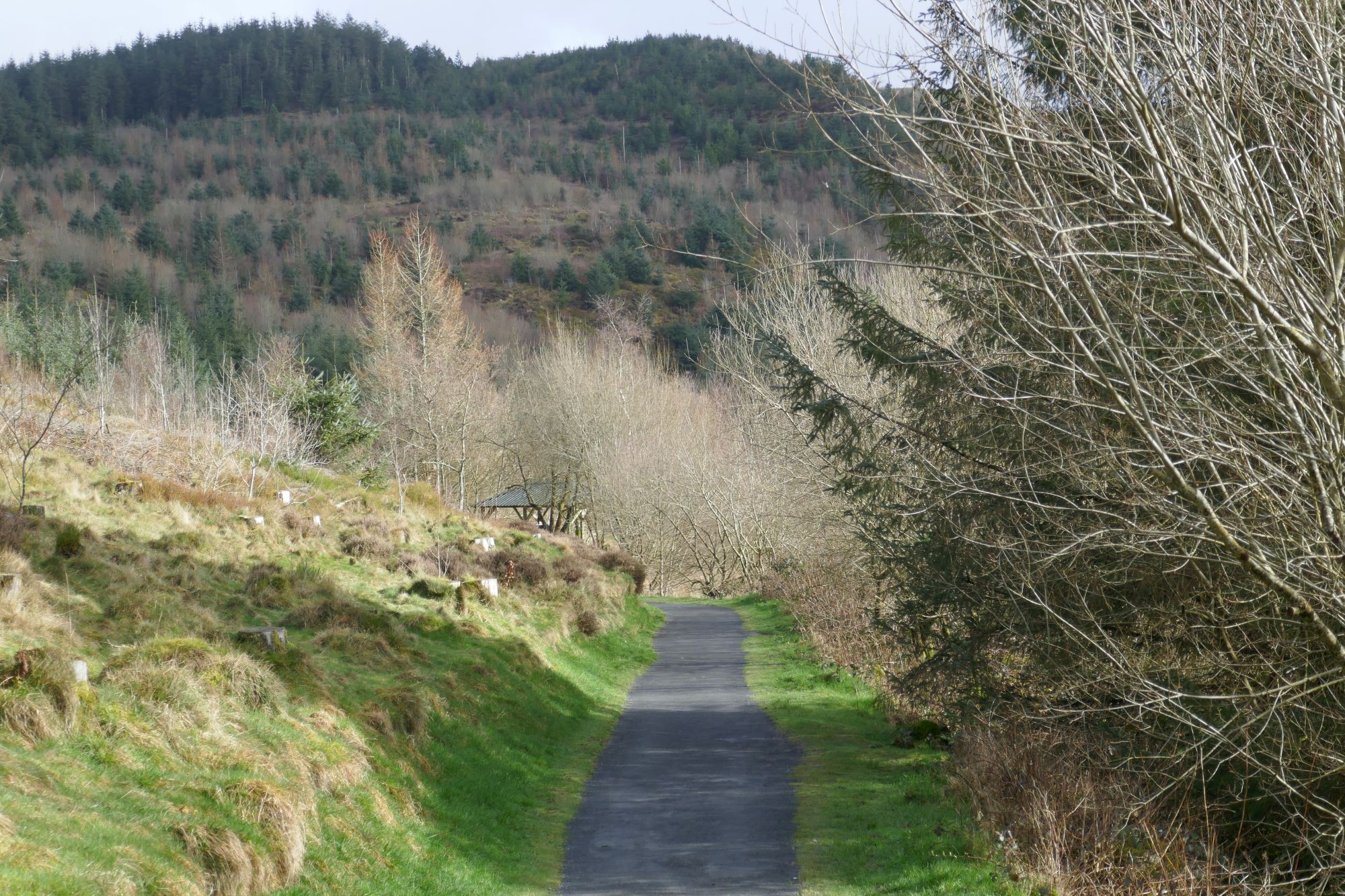 After about 1.5 km from the ford at Point 10, you pass through a gate into forest which is part of the NRW Nant yr Arian area. Here, go left on the track, briefly uphill, then descending in the direction of the Visitor Centre.