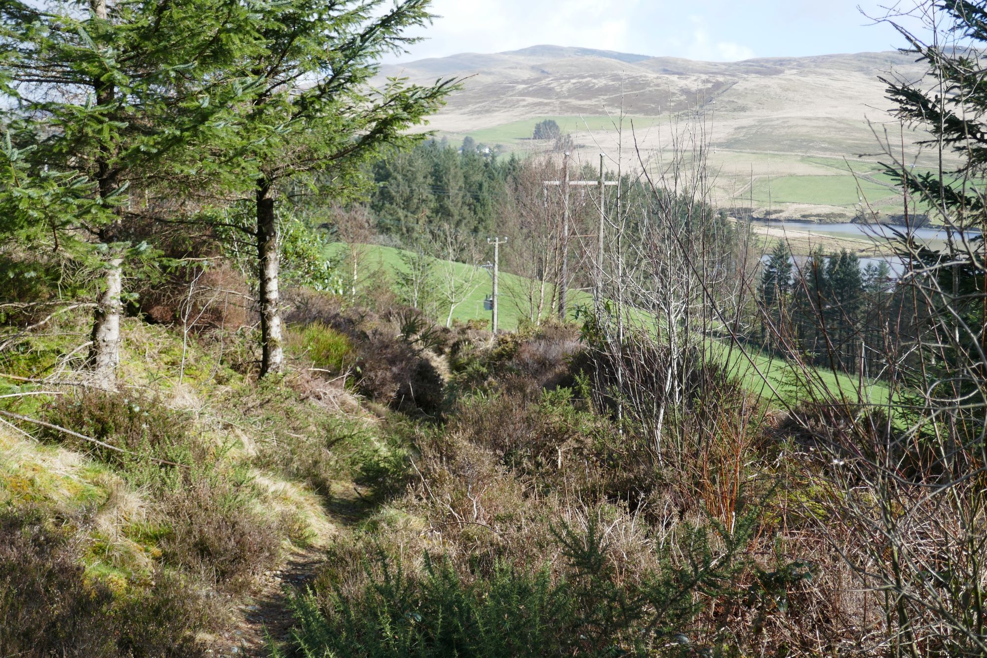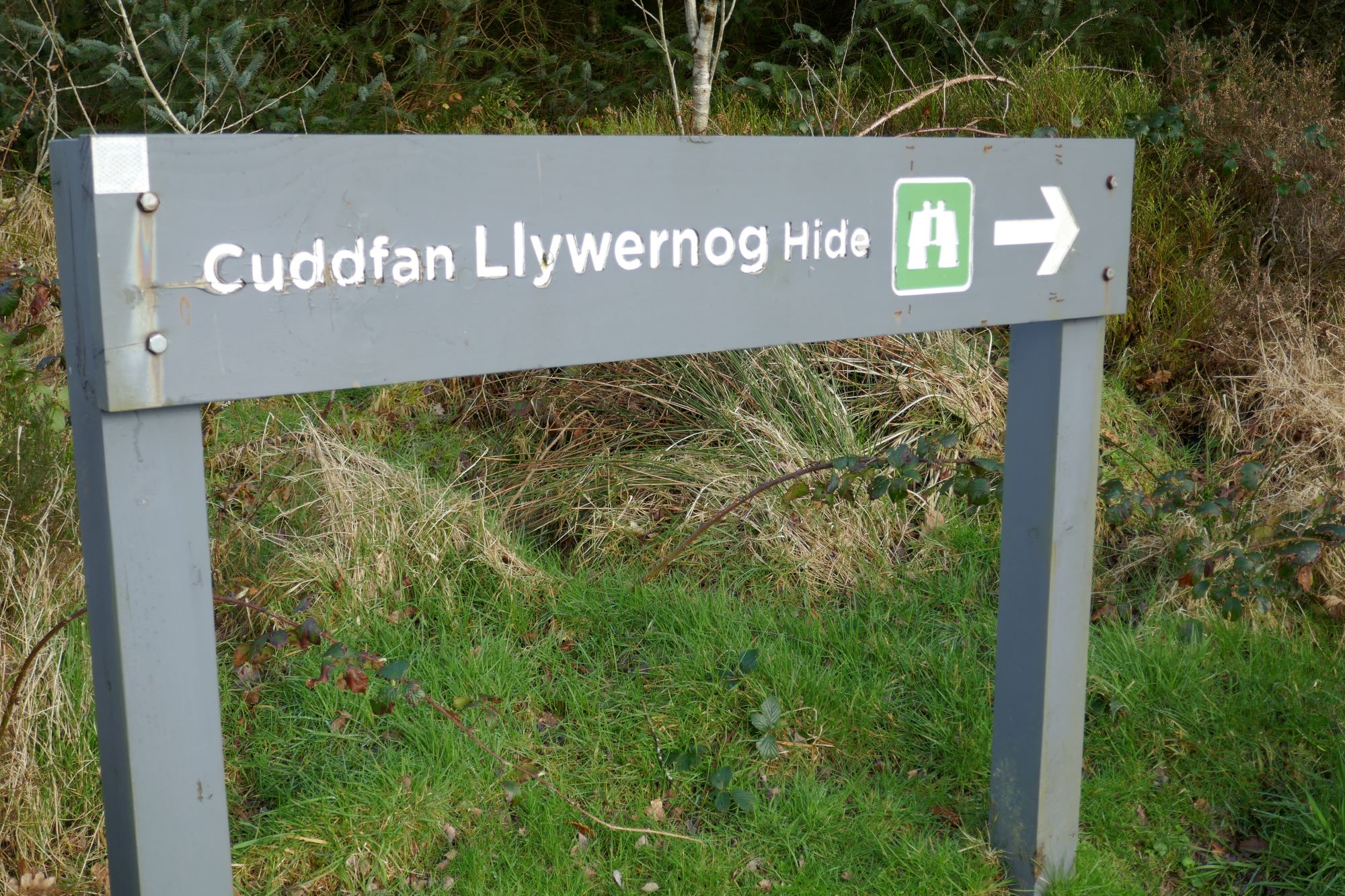 There is a somewhat perplexing system of surfaced footpaths here, but follow the signs to ‘Cyddfan Llywernog Hide’, and once at the hide, ascend a small path going uphill a short way(see right hand pic below), then turn right on a clear track that you join.