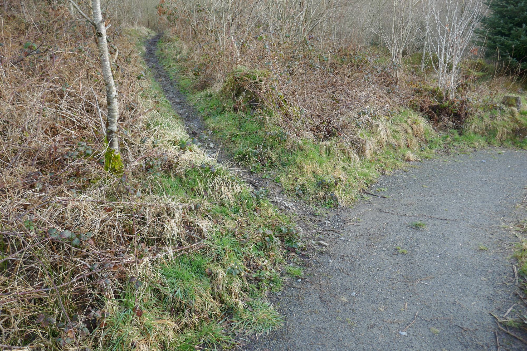 The rather faint path joins a clearer bridle track ascending left quite steeply uphill.(see right-hand pic below)