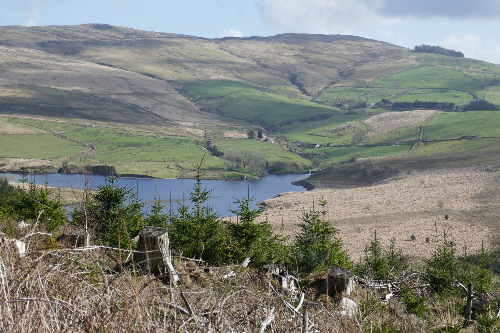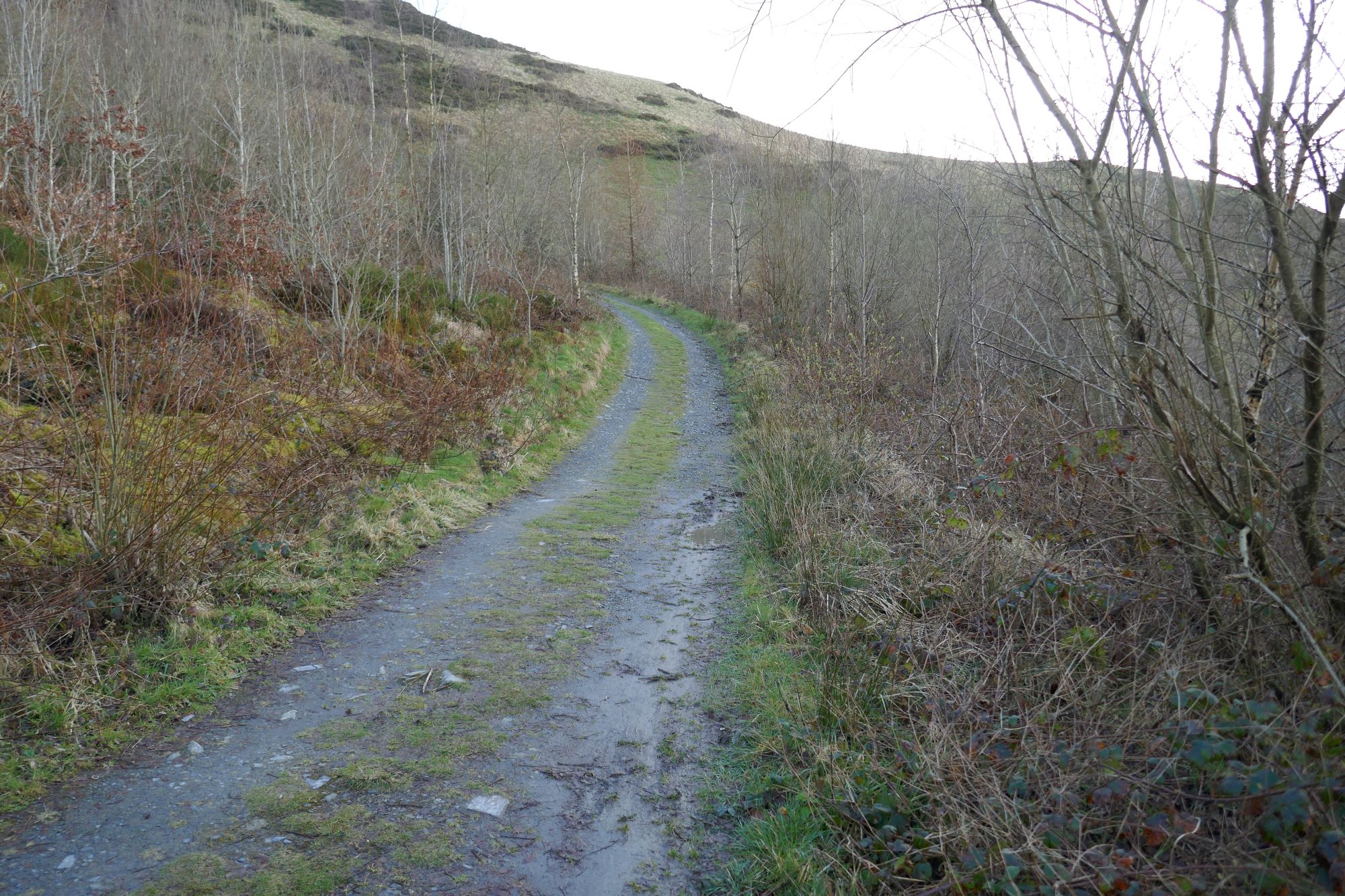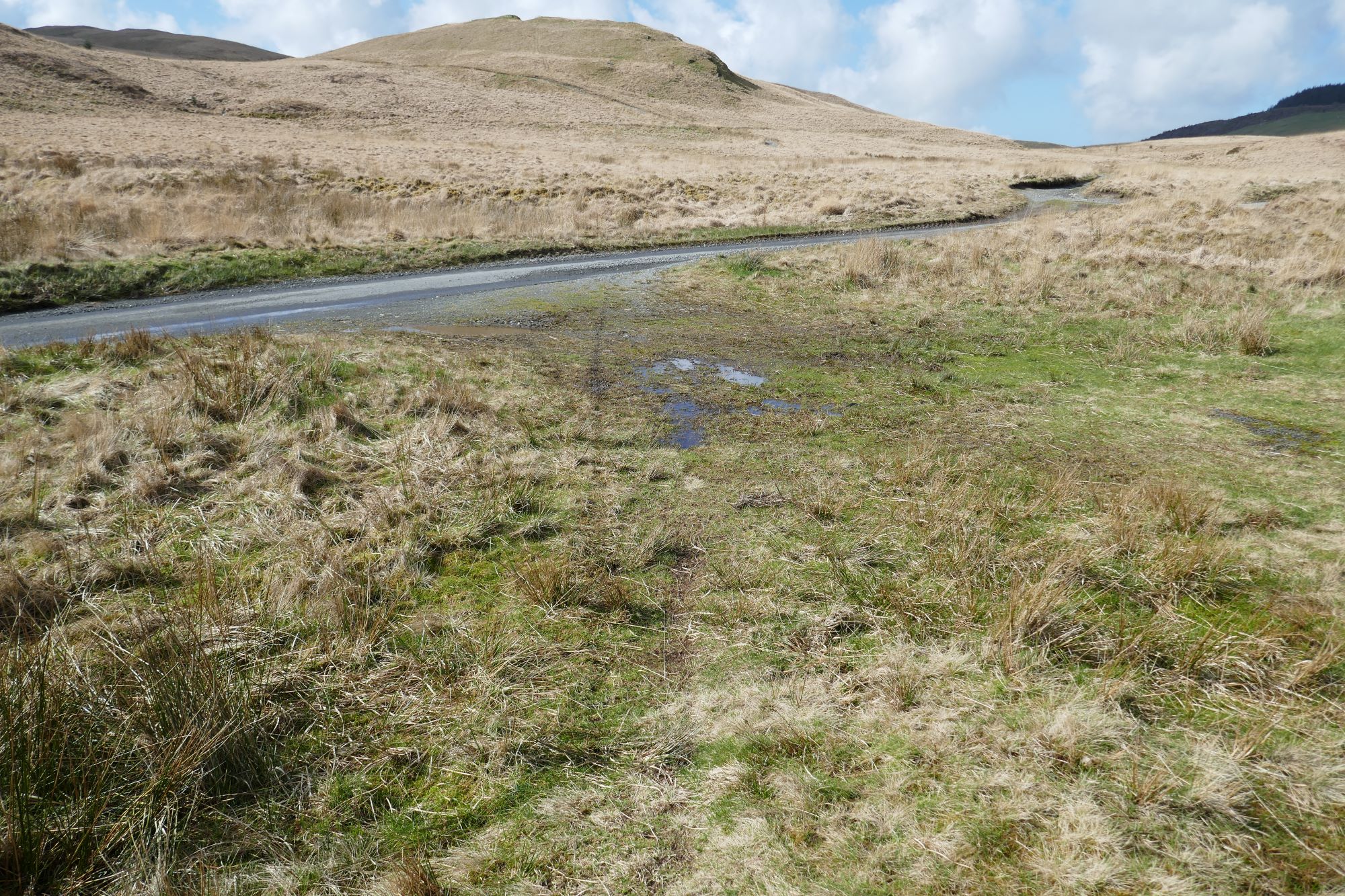From here, a path descends slightly to the left roughly NNW, with Disgwylfa Fawr in front of you. After a boggy patch, this meets a clear stony track which you need to follow to the left over the upper reaches of Nant Dinas.