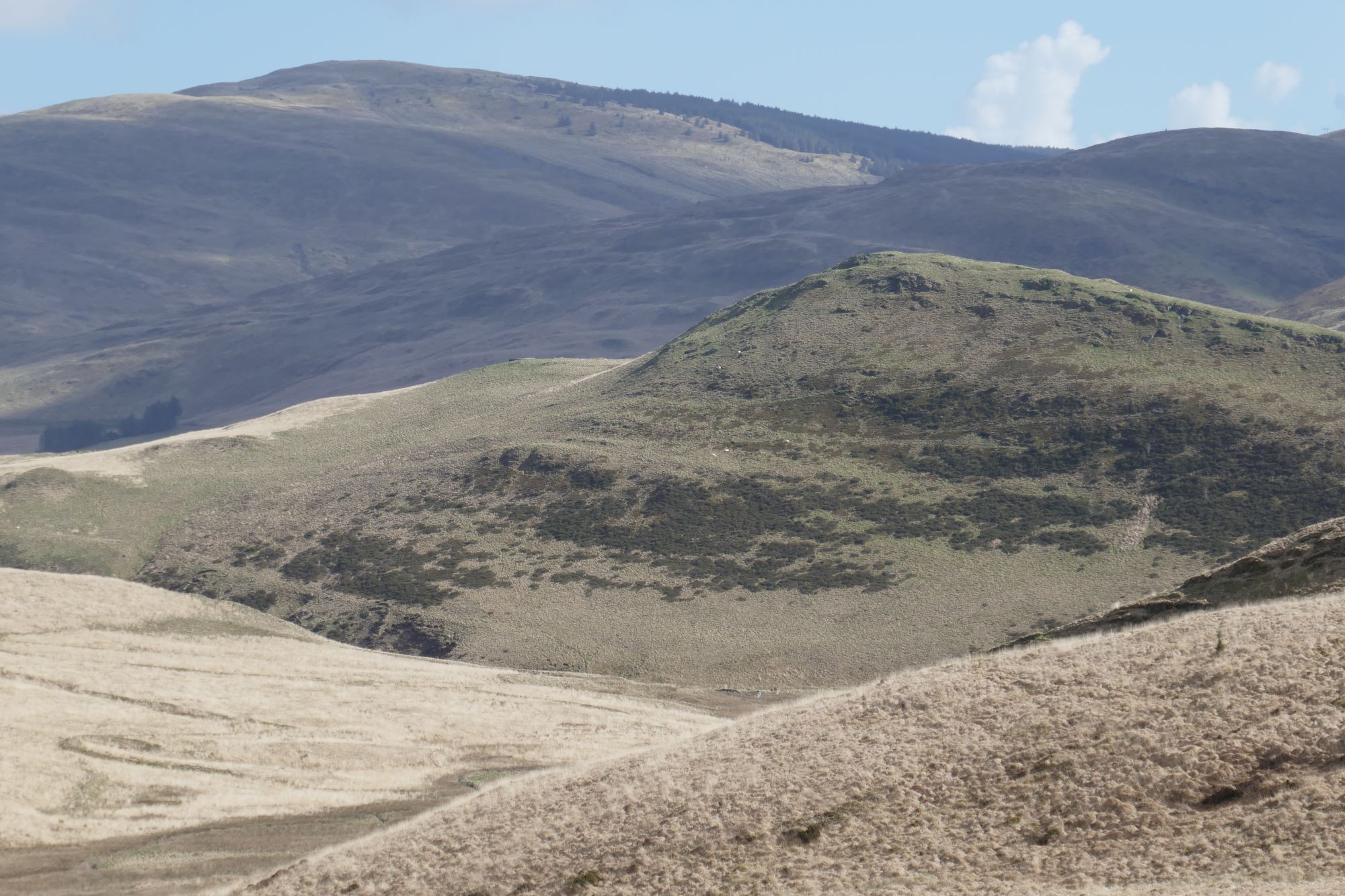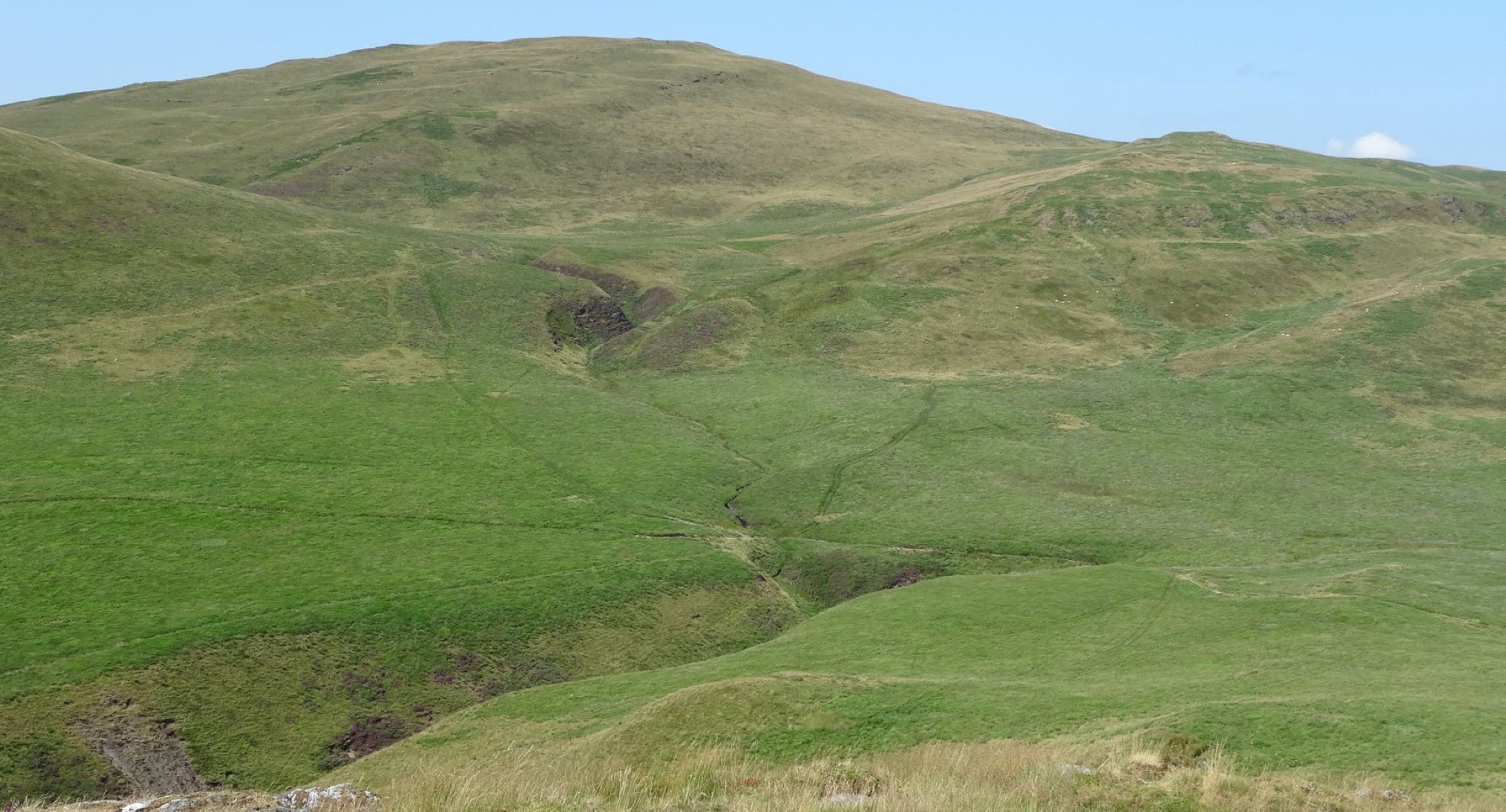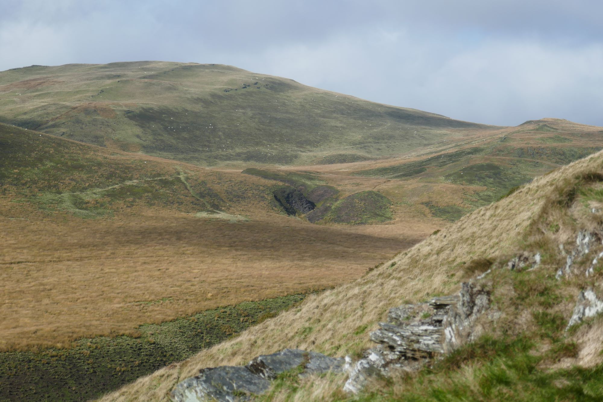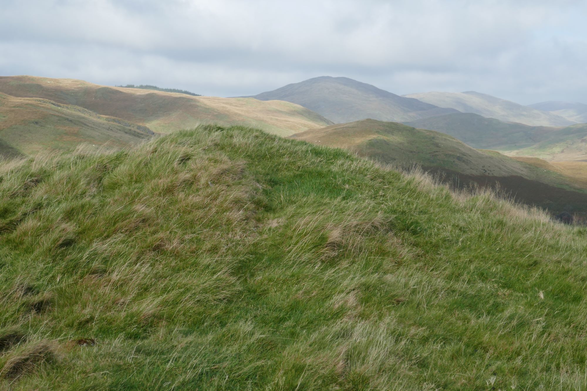 The summit has much eroded and slightly vague ramparts, but a definite highest point, which is a good place for a stop to admire the magnificent view. The nearest high hill is Dysgwylfa Fawr to the left as you ascended, further away and round to the right are Pumlumon Fawr, with the gentle profile of Y Garn to its right. In the full width pic below, the hill in shade is Drosgol, roughly to the north. Llyn Nant y Moch is close, but hidden by the intervening lower hills.