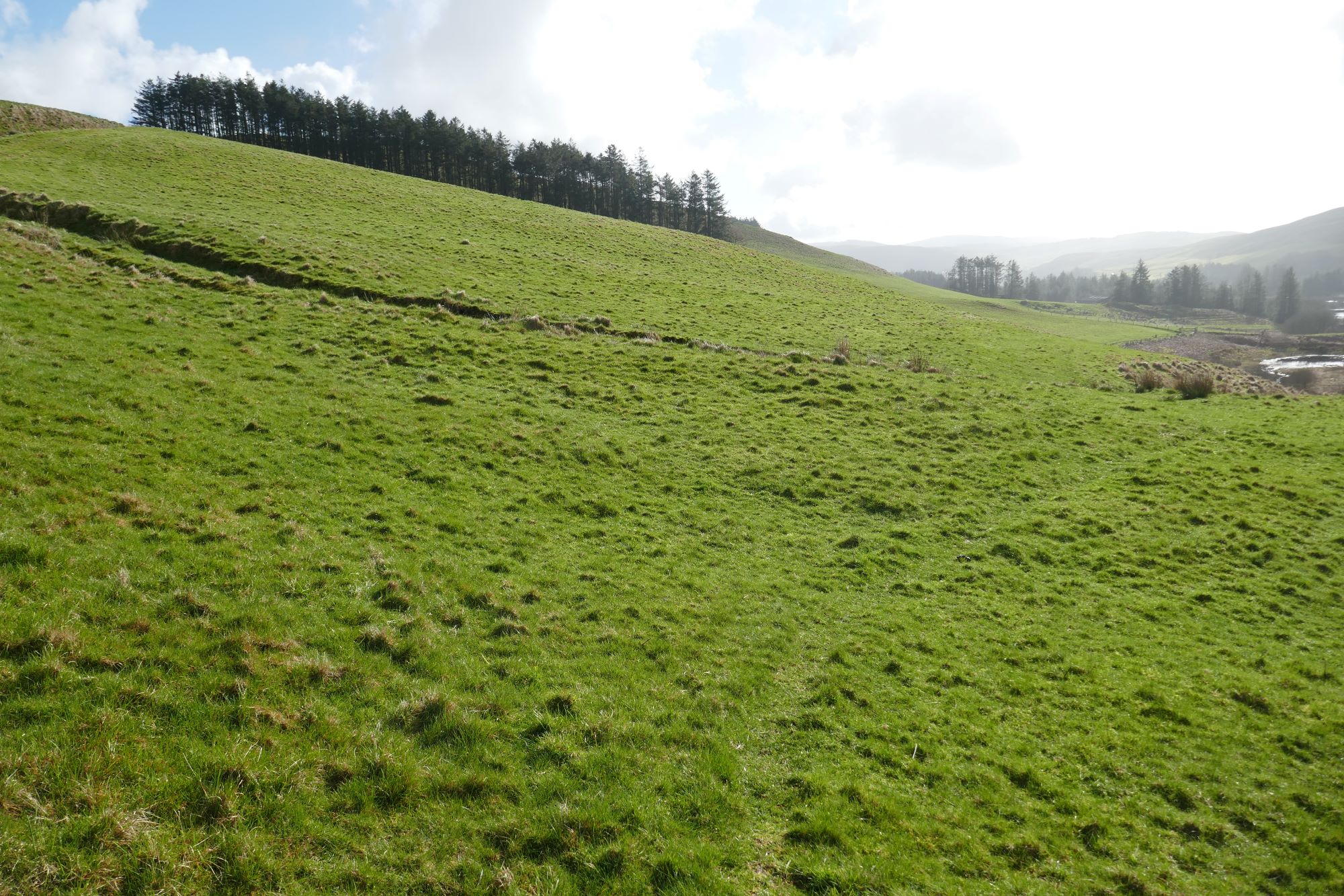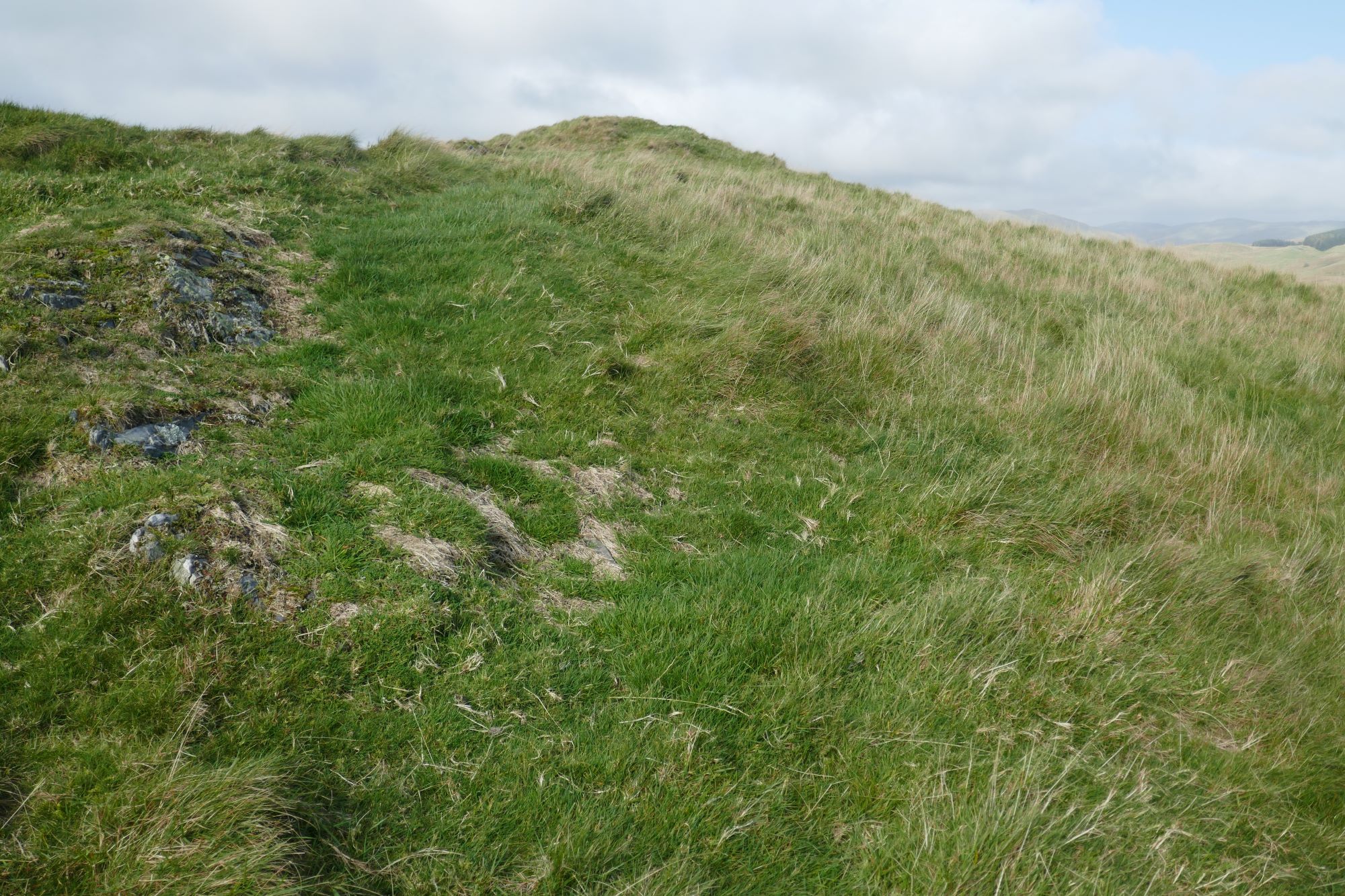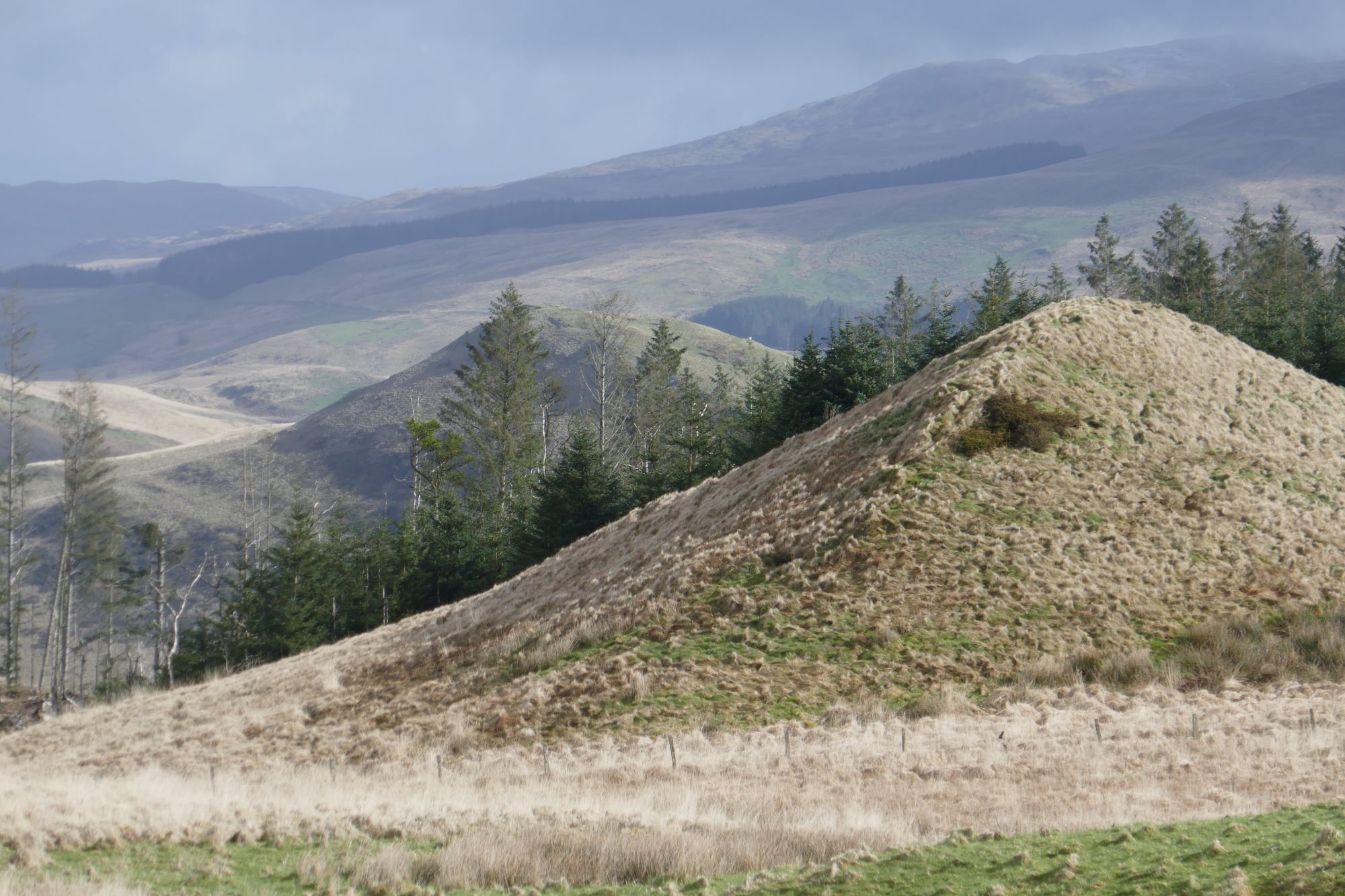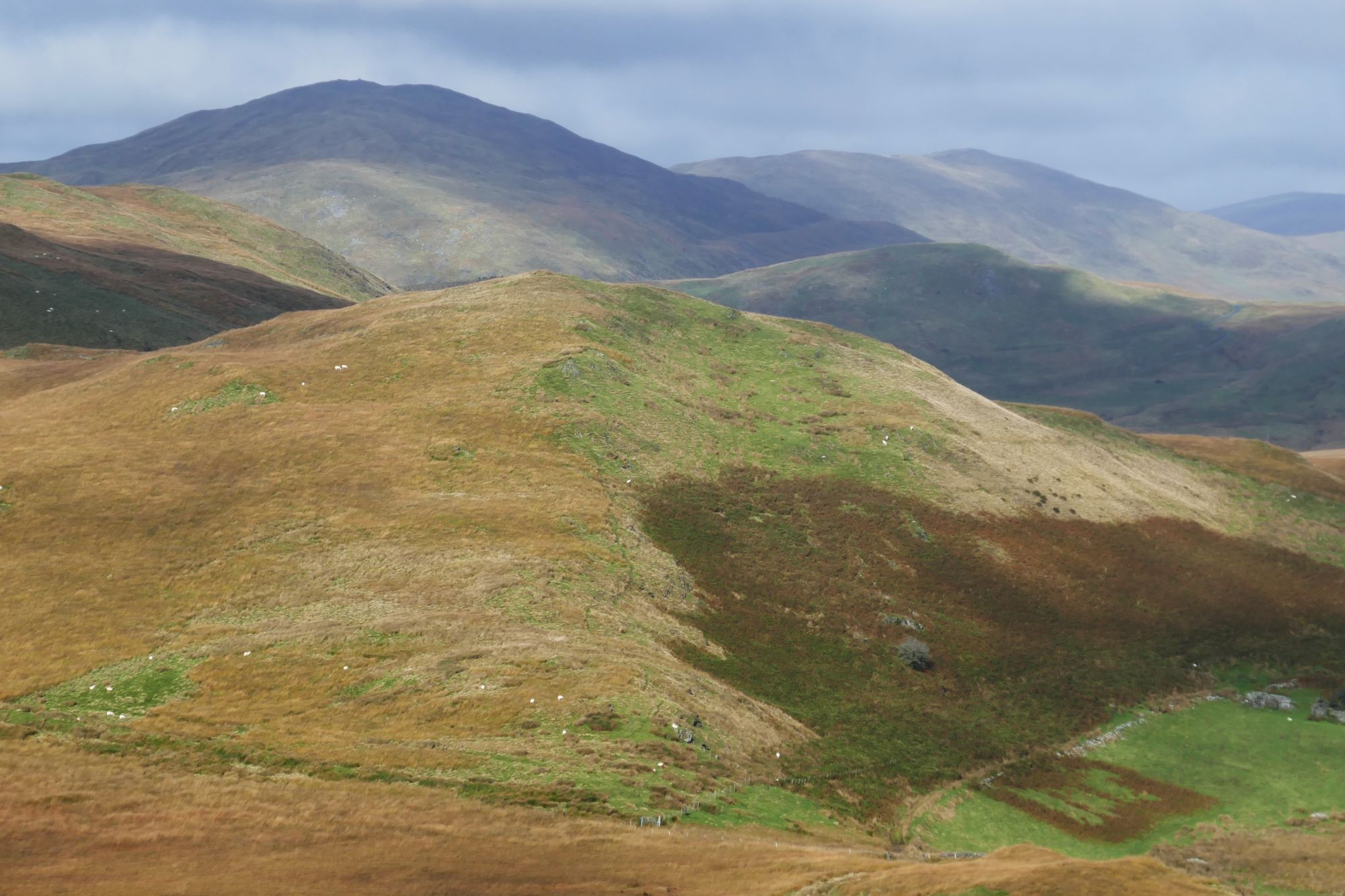 The summit has much eroded and slightly vague ramparts, but a definite highest point, which is a good place for a stop to admire the magnificent view. The nearest high hill is Dysgwylfa Fawr to the left as you ascended, further away and round to the right are Pumlumon Fawr, with the gentle profile of Y Garn to its right. In the full width pic below, the hill in shade is Drosgol, roughly to the north. Llyn Nant y Moch is close, but hidden by the intervening lower hills.