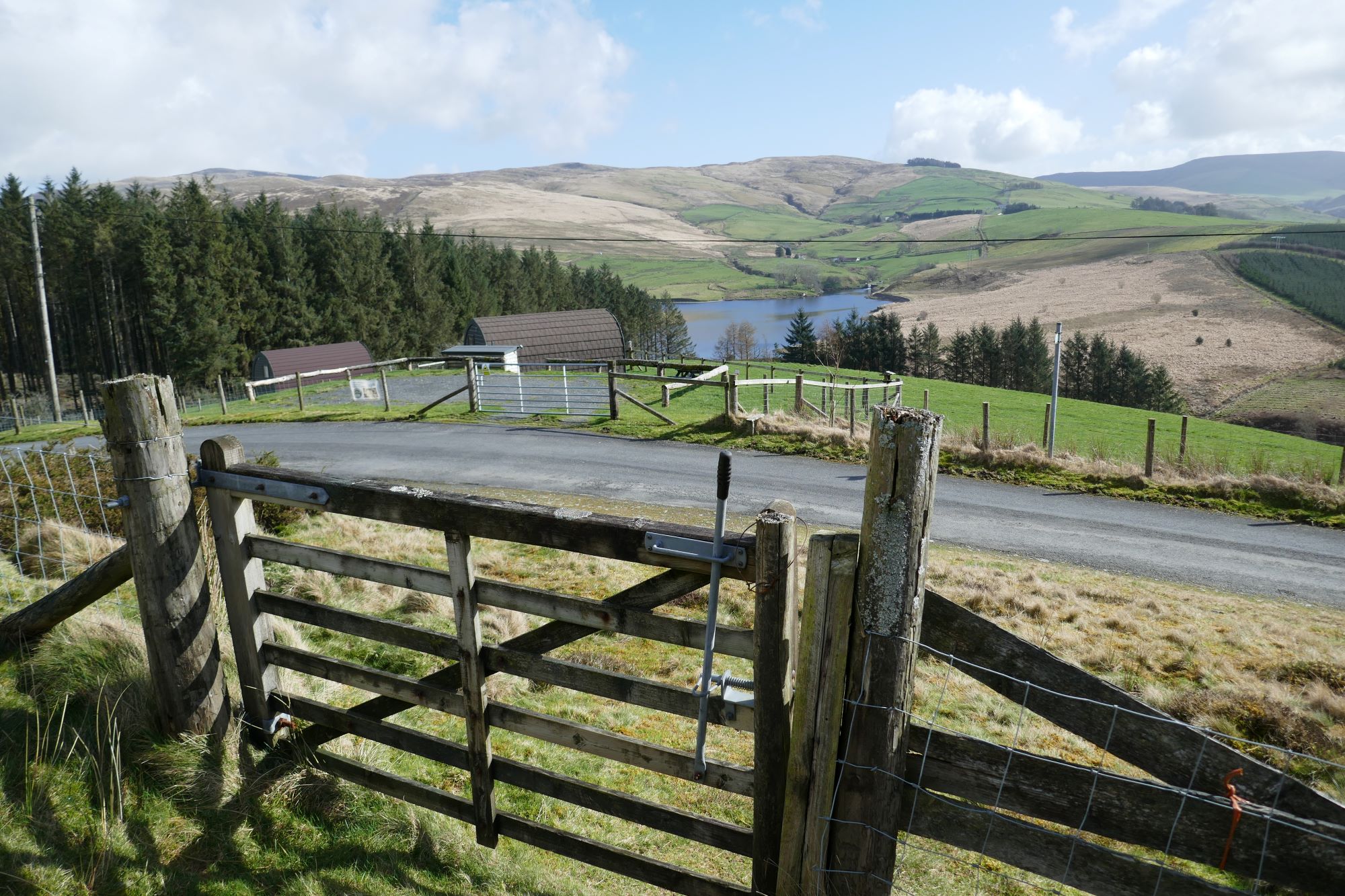 Soon this drops down towards a tarmac lane, and emerges onto it through a gate opposite a ‘glamping’ site.