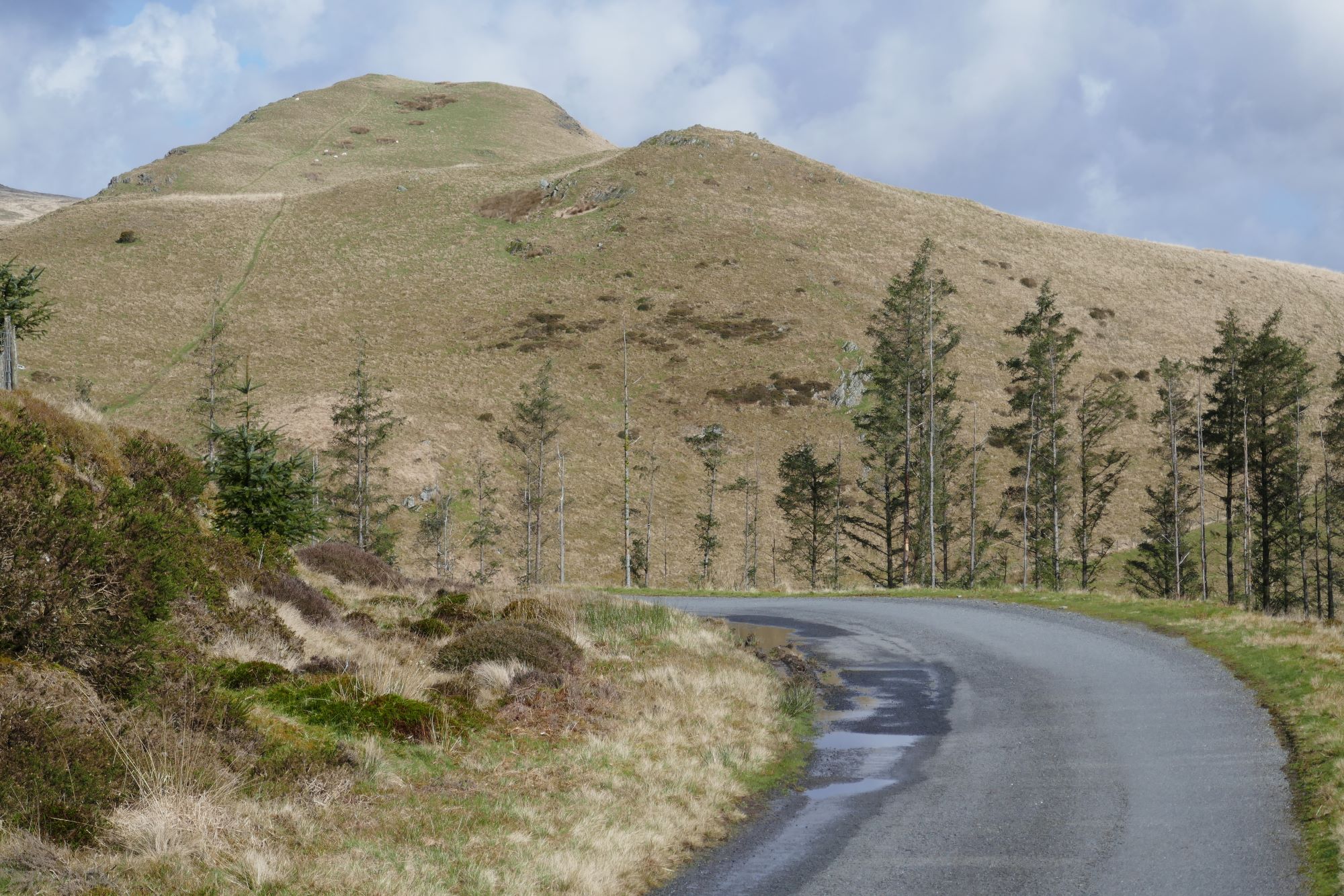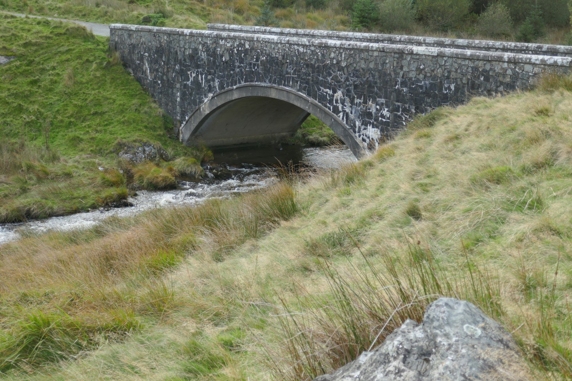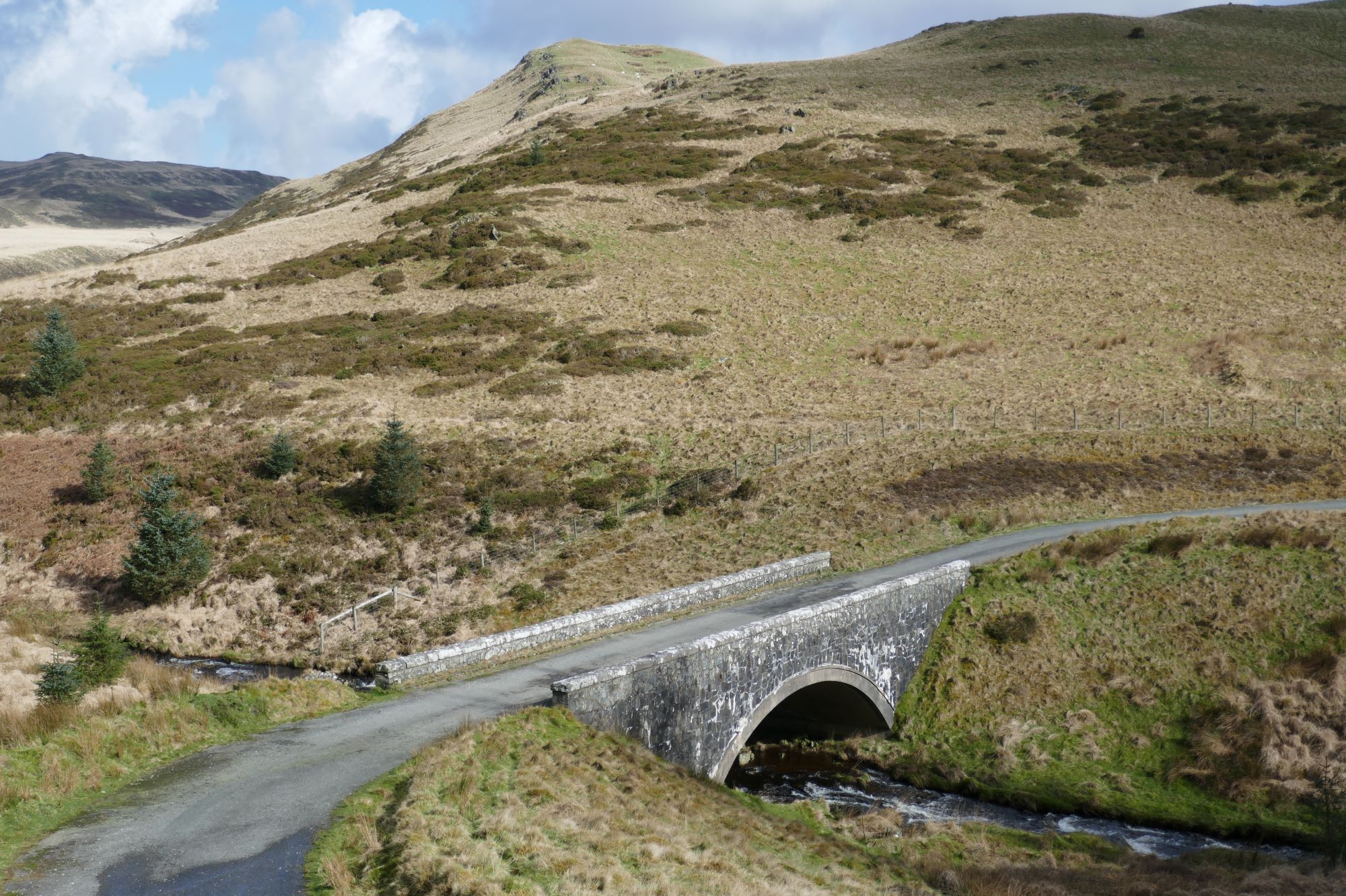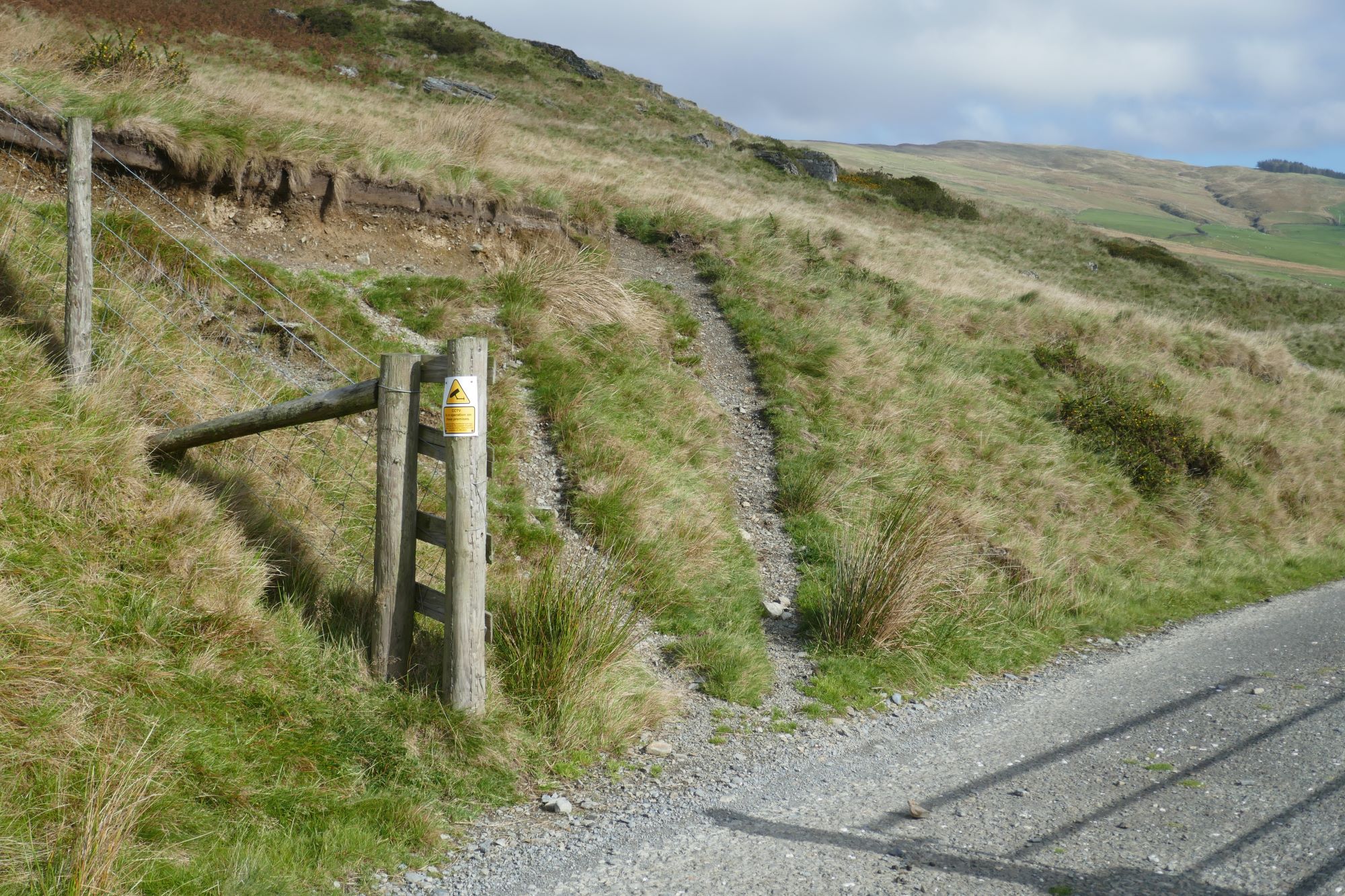 6. Turn right here and over a rather elegant bridge over a stream called Nant Dinas. A very short distance further on you arrive at an openable gate across the lane alongside a path climbing left up to Dinas summit.