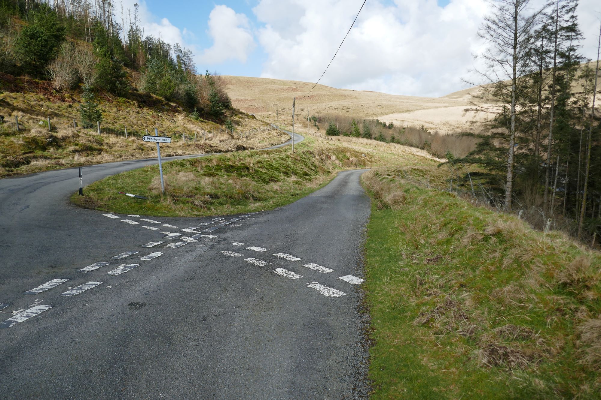 Turn left on the lane, and walk along the good verge for about 700m, admiring the great views all around. You will arrive at a point where the lane takes a sharp left turn signposted ‘Penrhyn-coch'...go straight on here, soon dropping down to the right.