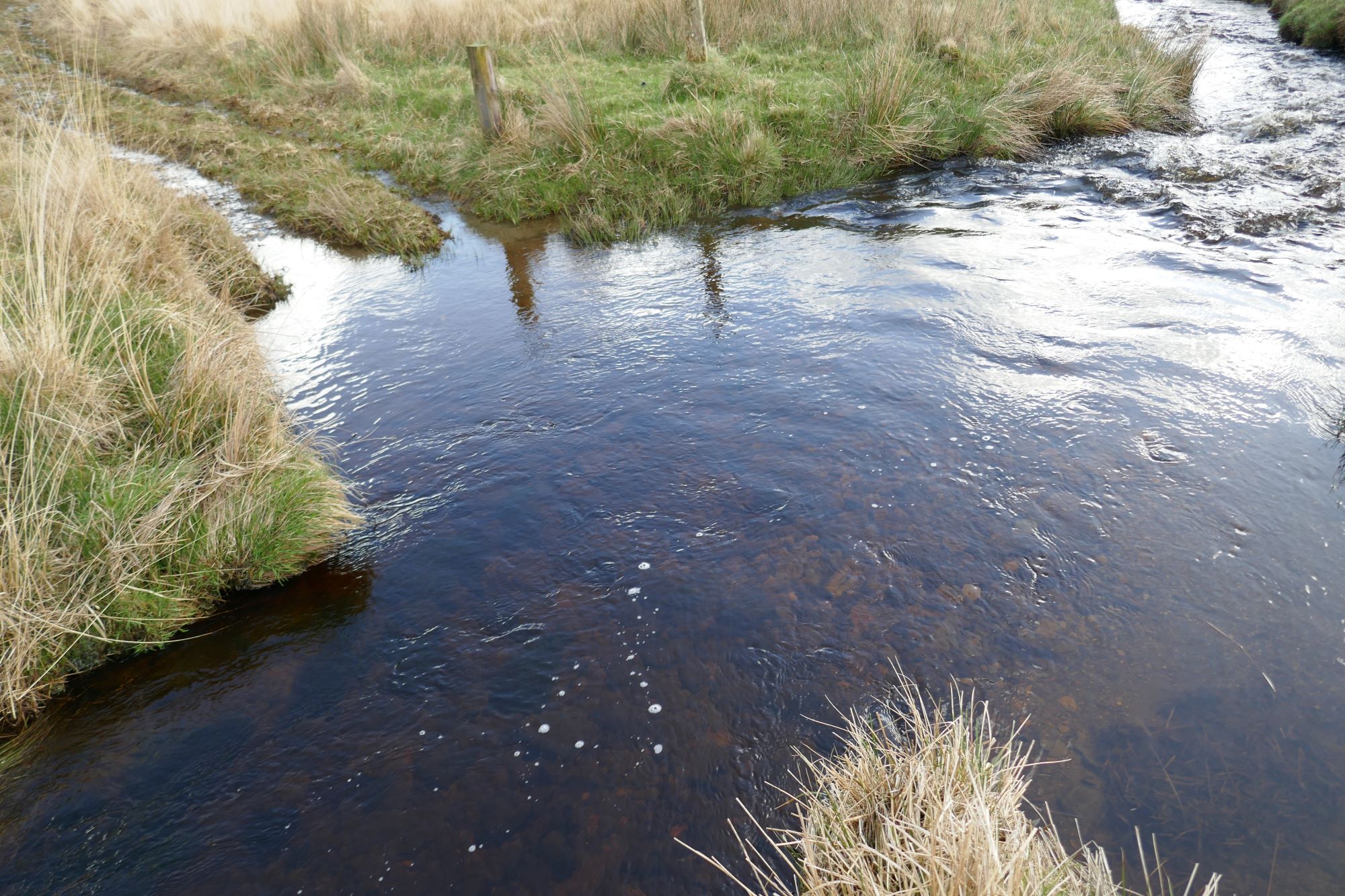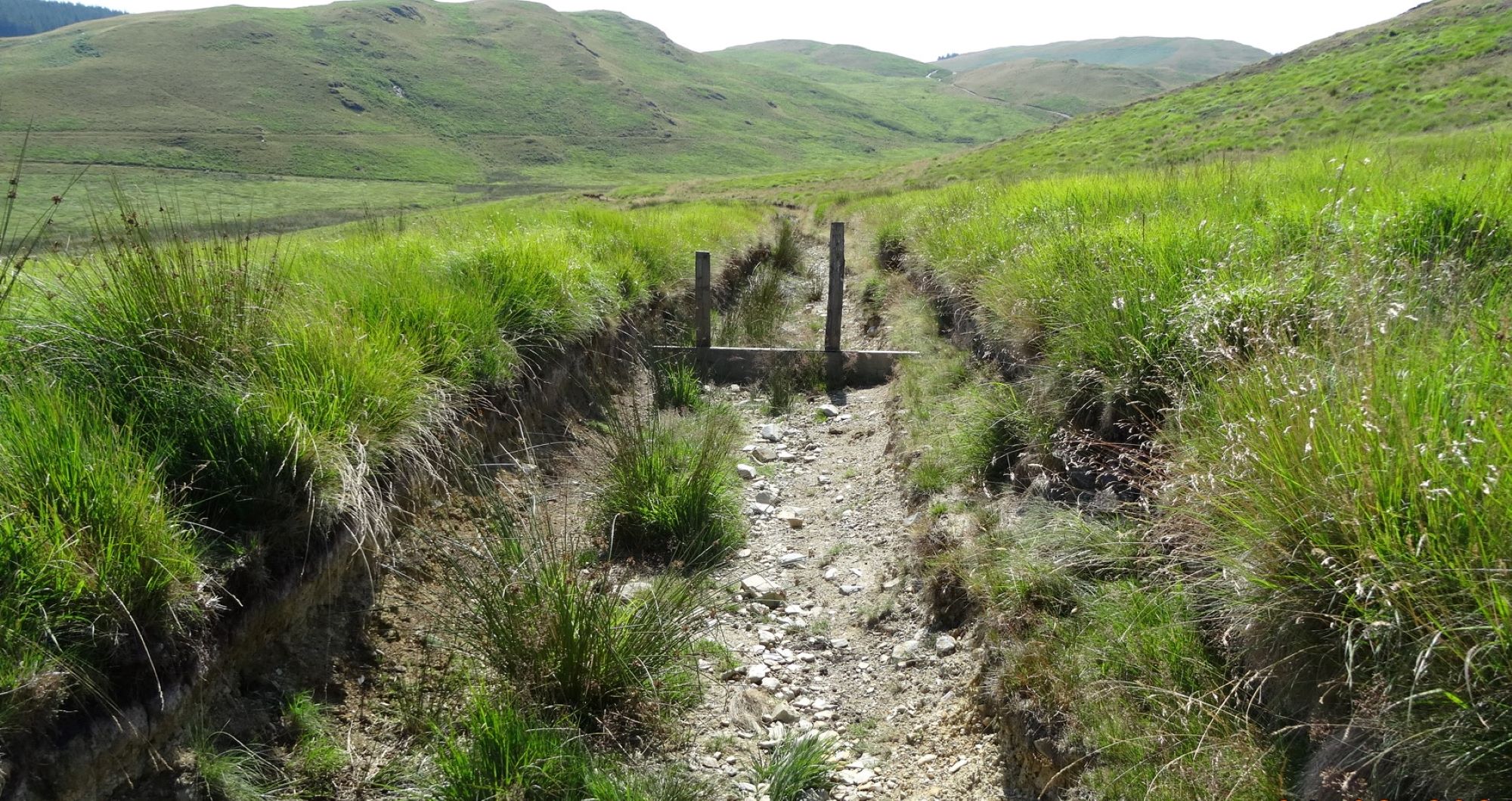 The map shows a ‘Restricted Byway’ (a byway open to all non-motorised traffic) descending the valley side, but this is deeply eroded in a gully and often wet and always hard work (see left-hand pic below). An alternative parallel track 10 m or so to its right may be a better option, accessed by walking a little way up the path coming down from Dysgwylfa Fach. Whichever you choose, you will arrive at the ‘ford’ crossing Nant Glan-dwr close to the tarmac lane (see right-hand pic below).